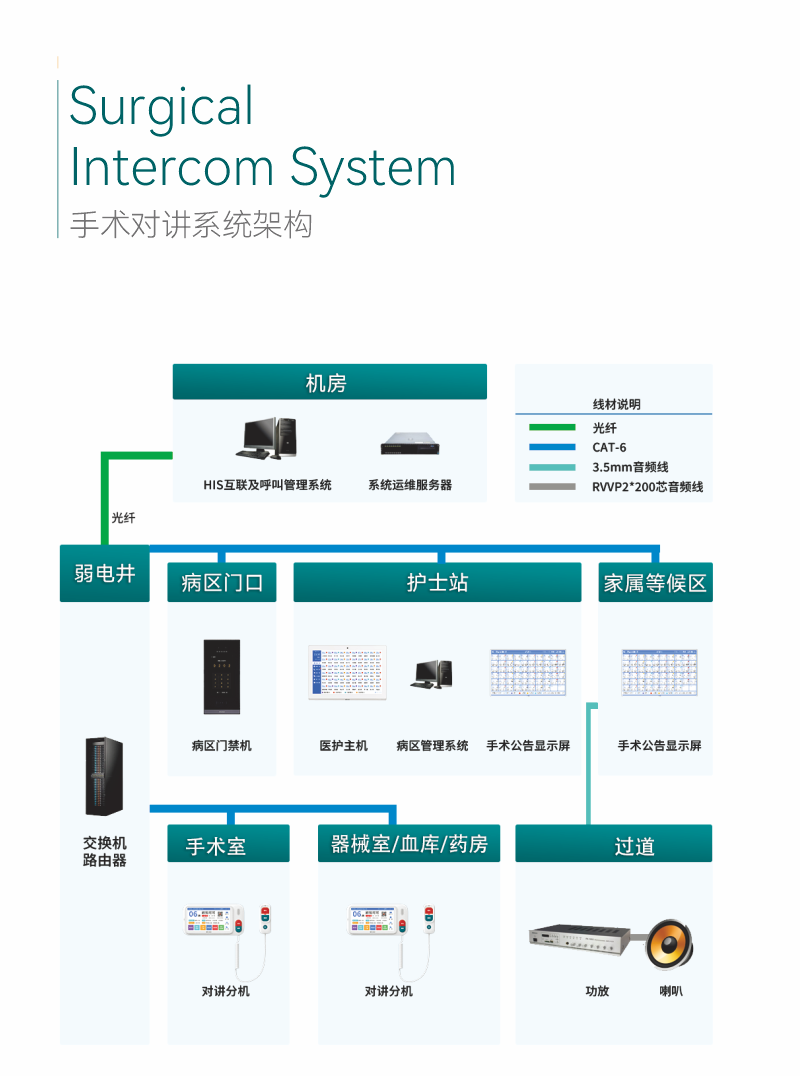 手術(shù)室對(duì)講系統(tǒng)主要由病區(qū)醫(yī)護(hù)對(duì)講管理系統(tǒng)、醫(yī)護(hù)主機(jī)、手術(shù)室分機(jī)、多媒體信息發(fā)布器、手術(shù)公告顯示屏、手術(shù)狀態(tài)顯示屏、功放、吸頂喇叭、手術(shù)室病區(qū)出入口的門(mén)禁主機(jī)等組成。