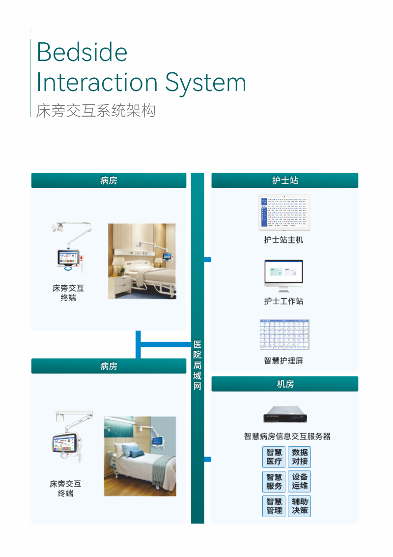 基于IP網(wǎng)絡(luò)通訊技術(shù),采用專(zhuān)業(yè)化智能硬件設(shè)備,搭載醫(yī)護(hù)患信息交互軟件,集患者服務(wù)、床旁護(hù)理服務(wù)、醫(yī)生查房服務(wù)等業(yè)務(wù)于一體的智能化信息交互系統(tǒng)。