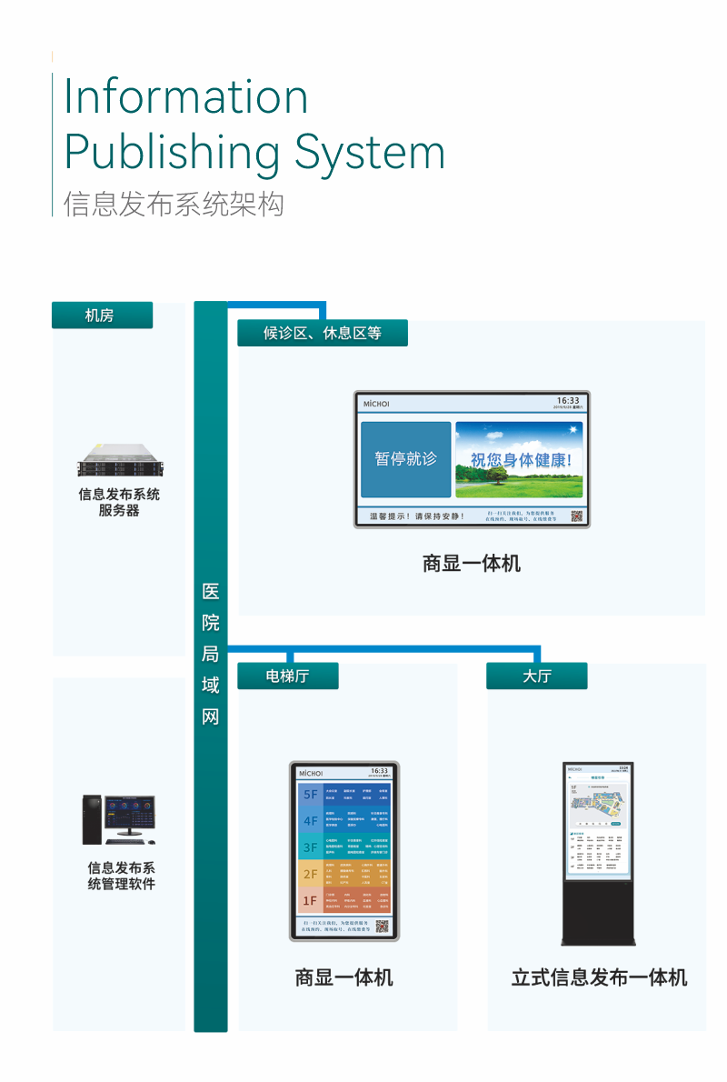 由服務(wù)器、網(wǎng)絡(luò)、管理軟件、顯示終端組成,采用易布置且安全穩(wěn)定的B/S架構(gòu)來(lái)給醫(yī)院、寫字樓、商場(chǎng)和社區(qū)等場(chǎng)景提供高效率的信息傳遞。該系統(tǒng)可以精準(zhǔn)投放、修改內(nèi)容至指定的顯示終端,為各場(chǎng)景的用戶提供精準(zhǔn)的導(dǎo)引和信息的實(shí)時(shí)發(fā)布。