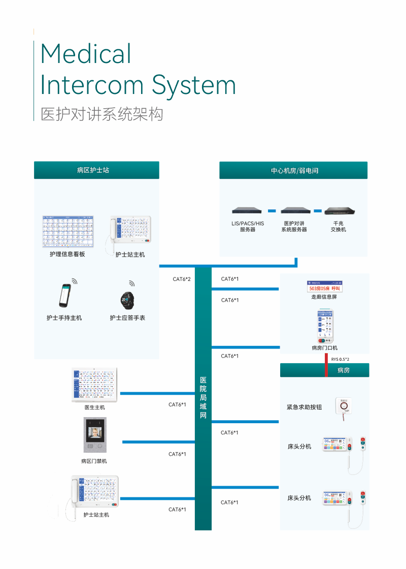 主要應(yīng)用于醫(yī)院住院病區(qū)、養(yǎng)老院等場(chǎng)景,是連接護(hù)理工作人員與患者之間的溝通橋梁,其中床頭分機(jī)、病房門口機(jī)、緊急求助按鈕等設(shè)備可一鍵呼叫護(hù)士站主機(jī)或移動(dòng)終端設(shè)備,提示護(hù)士及時(shí)發(fā)現(xiàn)并處置,同時(shí)護(hù)士接通后可實(shí)現(xiàn)雙向通話對(duì)講,本系統(tǒng)可與醫(yī)院現(xiàn)有HIS系統(tǒng)實(shí)現(xiàn)對(duì)接,將患者的基本信息同步到床頭分機(jī)、病房門口機(jī)等設(shè)備上顯示,同時(shí)提供托管轉(zhuǎn)移、病區(qū)廣播、呼叫記錄存儲(chǔ)、護(hù)士定位、語(yǔ)音提醒、信息發(fā)布等功能,大幅提高護(hù)理工作質(zhì)量和效率、助力醫(yī)療服務(wù)無(wú)紙化、推動(dòng)醫(yī)療護(hù)理數(shù)字化轉(zhuǎn)型。